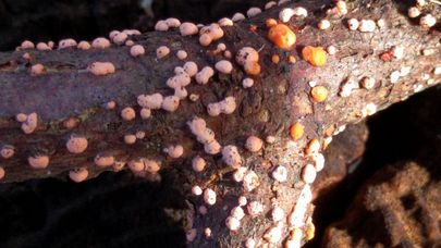 - Beskrivelse - Lyserøde klatter, der til sidst bliver rødbrune og meget hårde. De enkelte klatter er 1 til 4 mm i diameter.