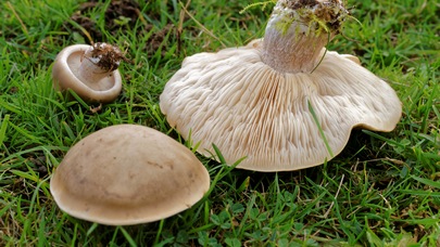 Algunas setas Cortinarius tienen pie azules y sombreros parduscos; sin embargo, crecen más en bosques que en campos abiertos.