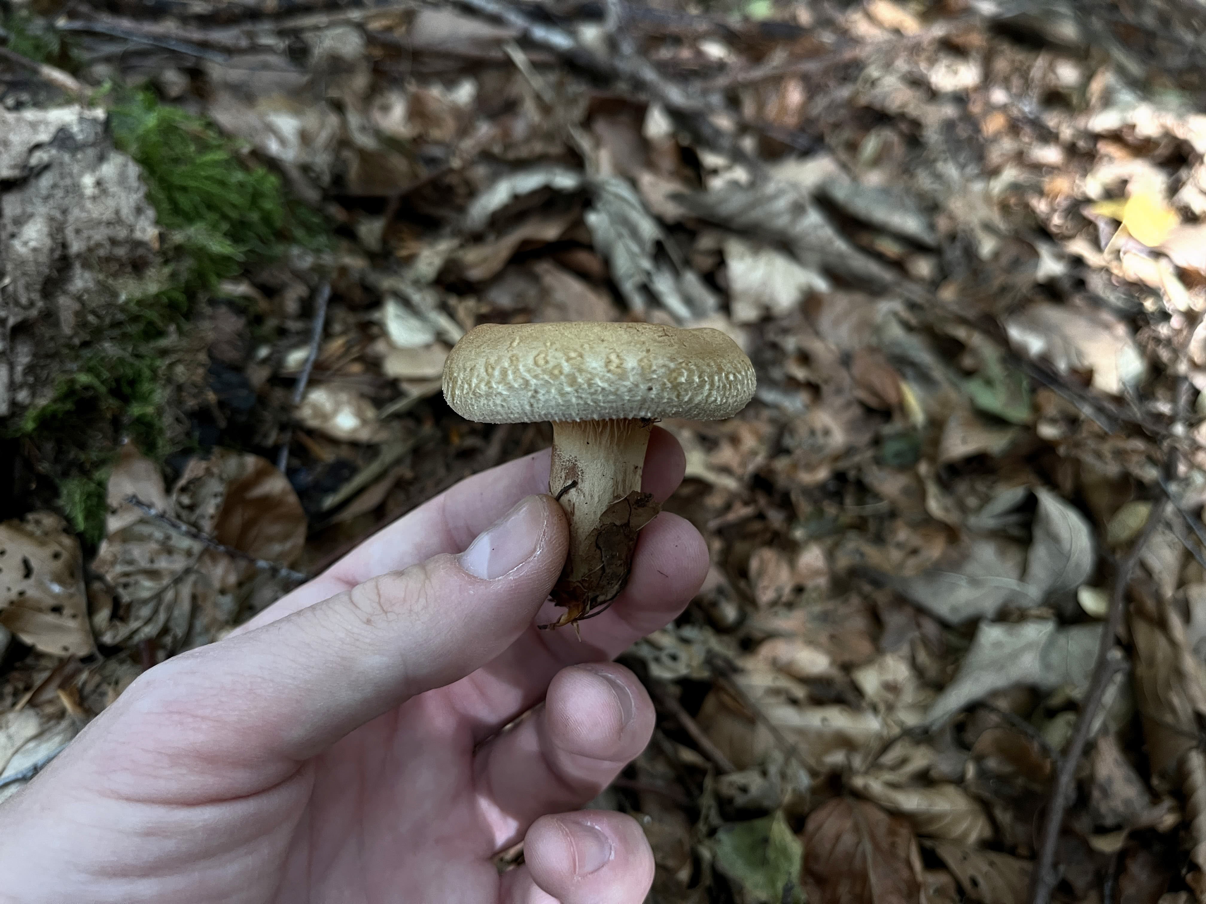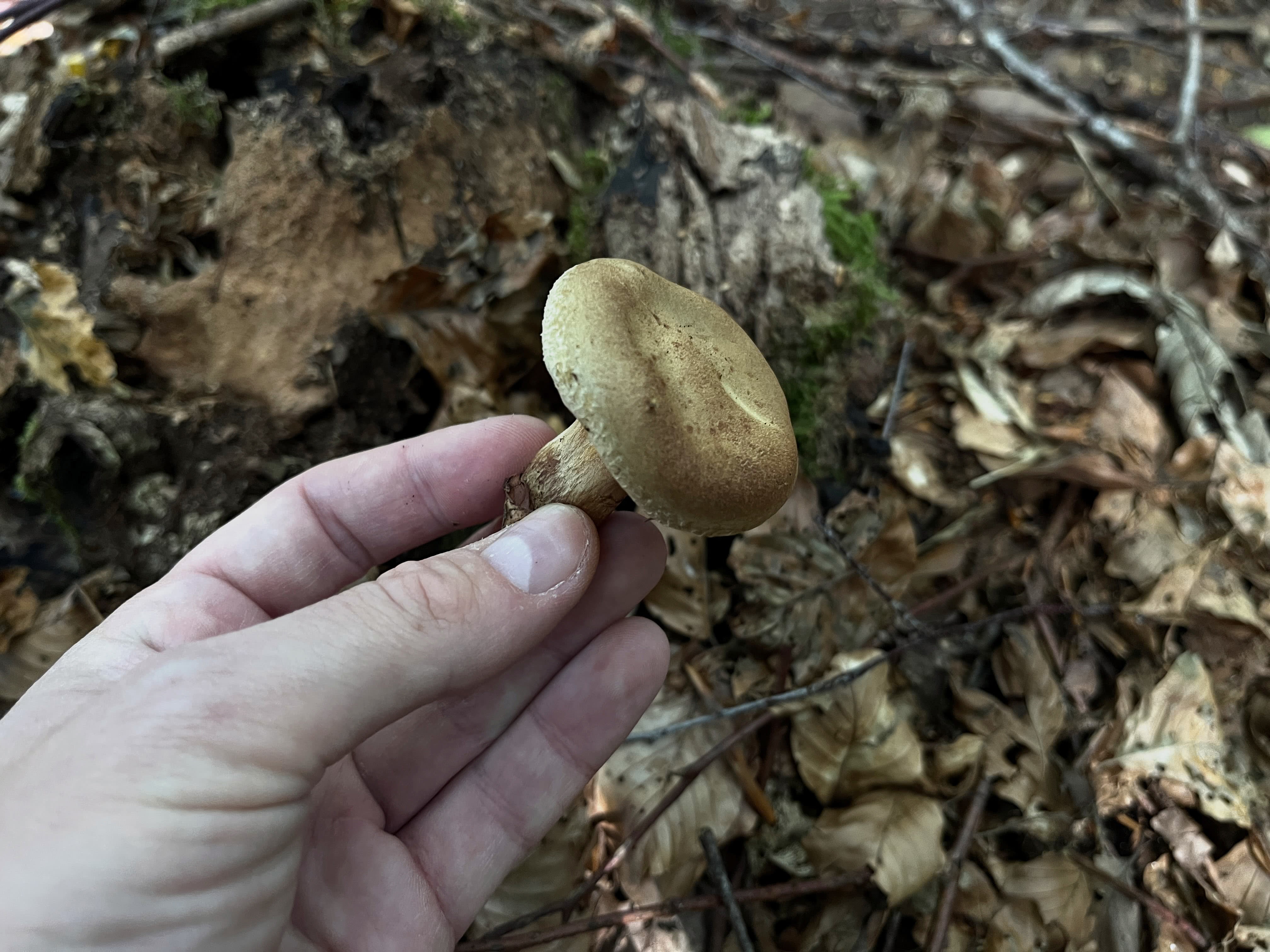 Champignon plus grand avec un chapeau velouté et un pied court et épais couvert d'un duvet brun foncé. Se trouve généralement sur ou près des souches de conifères.