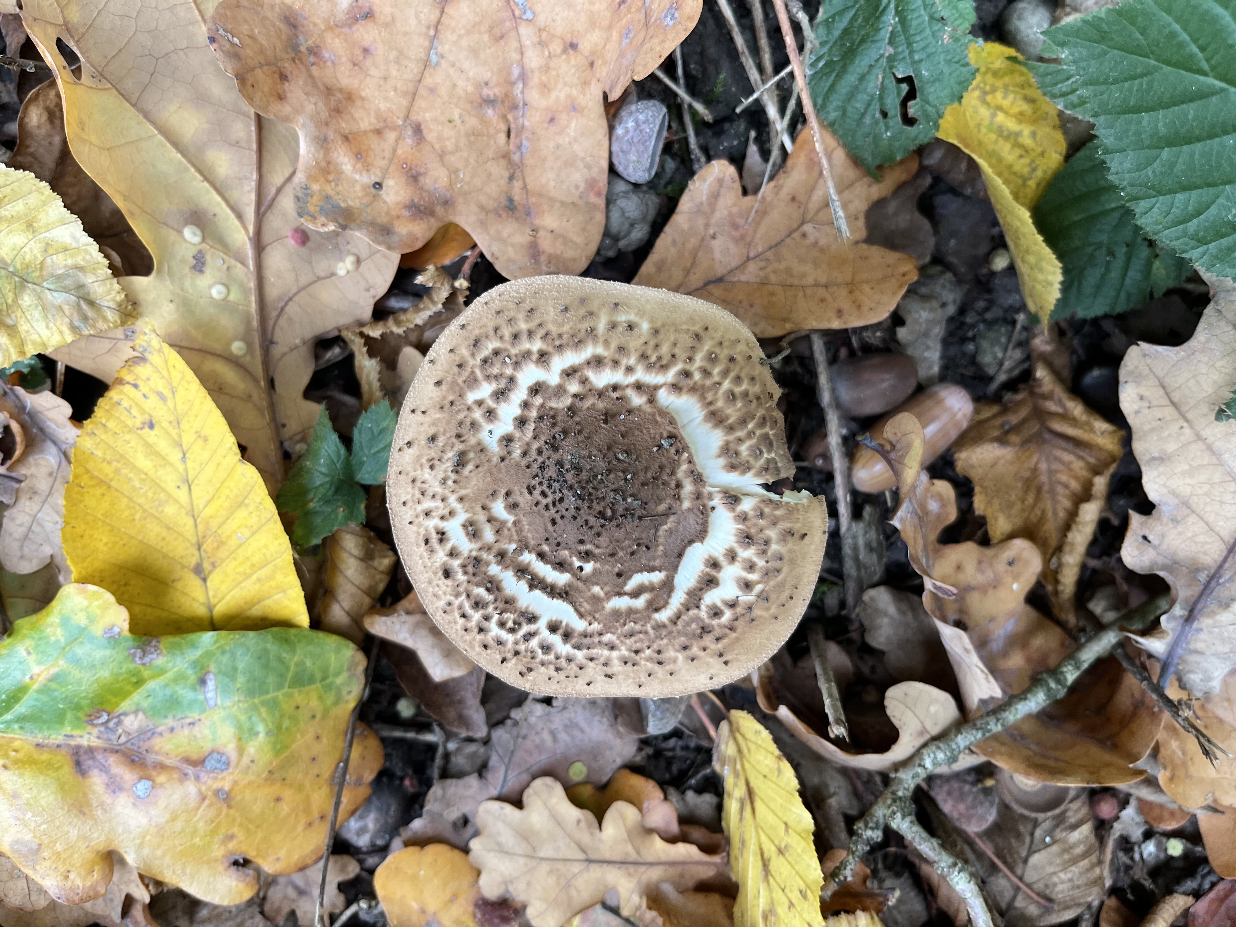 Le chapeau est brun pâle avec des écailles pyramidales brun foncé particulièrement concentrées au centre. Le chapeau est d'abord convexe, mais il s'ouvre à plat et présente des bords retournés avec l'âge.