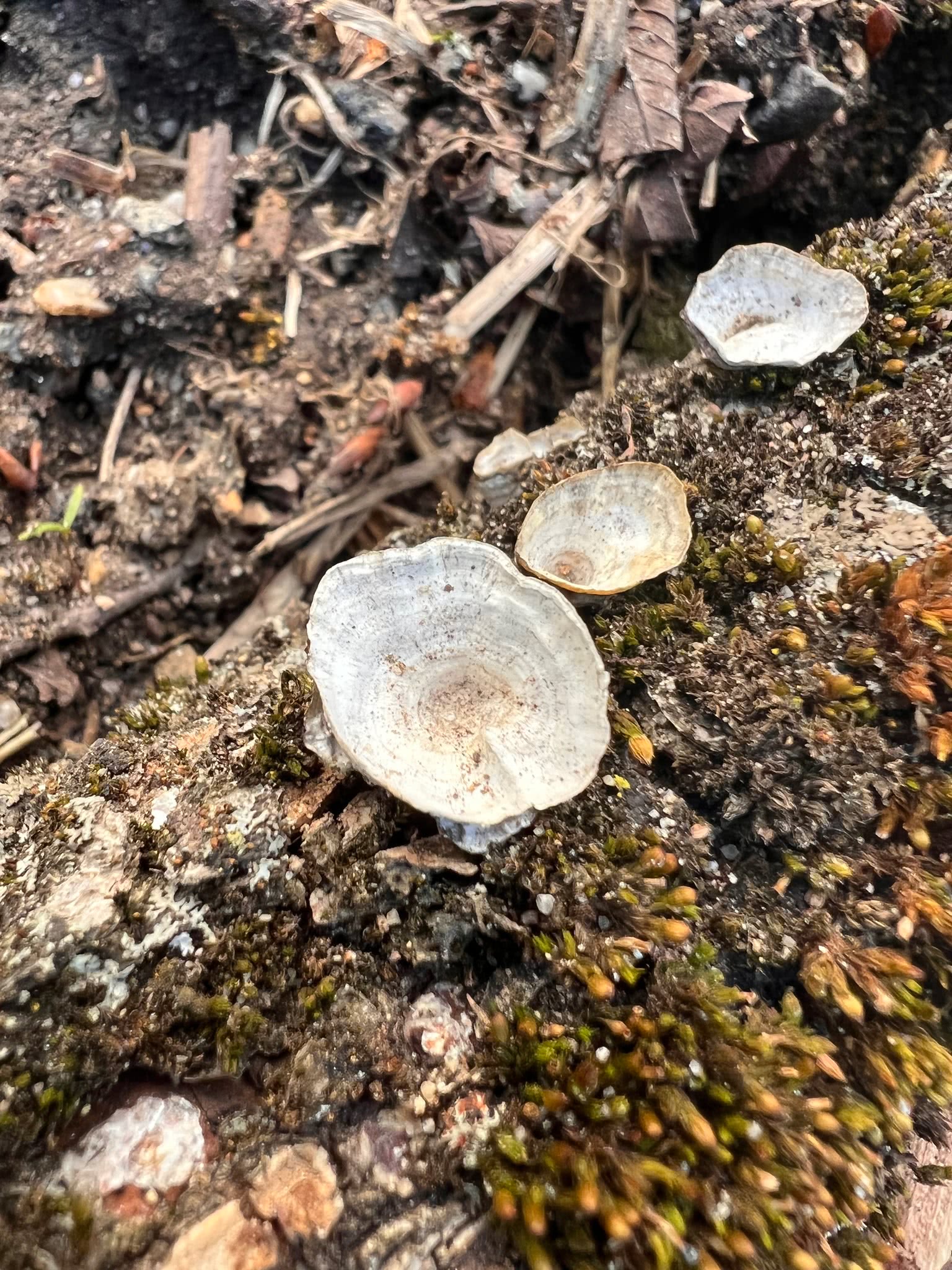 Da piattino a coppa, con un diametro fino a circa 15 mm. La superficie superiore varia dal bianco al marrone, tipicamente con zone di colore, e appare liscia. La superficie inferiore è bianca, accompagnata da una piccola struttura simile a un gambo.