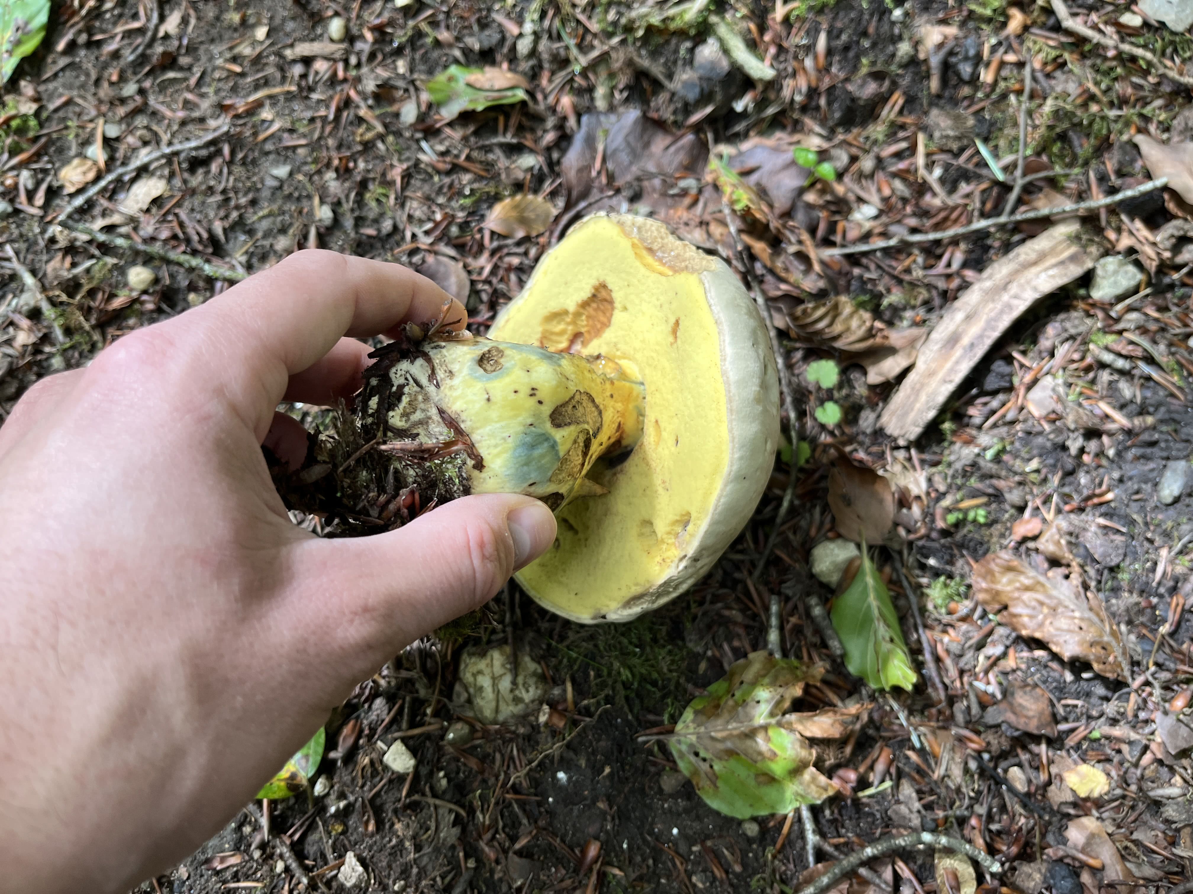 Negli esemplari più maturi, il cappello è spesso scurito, scanalato o ricoperto di scaglie, ma quando si gira il fungo si possono vedere i pori di un bel giallo brillante e i pezzetti di rosso sul gambo. Quando viene tagliata a metà, a volte la base del gambo è di colore rosso, mentre il resto della carne diventa lentamente blu e poco dopo il blu inizia a svanire.