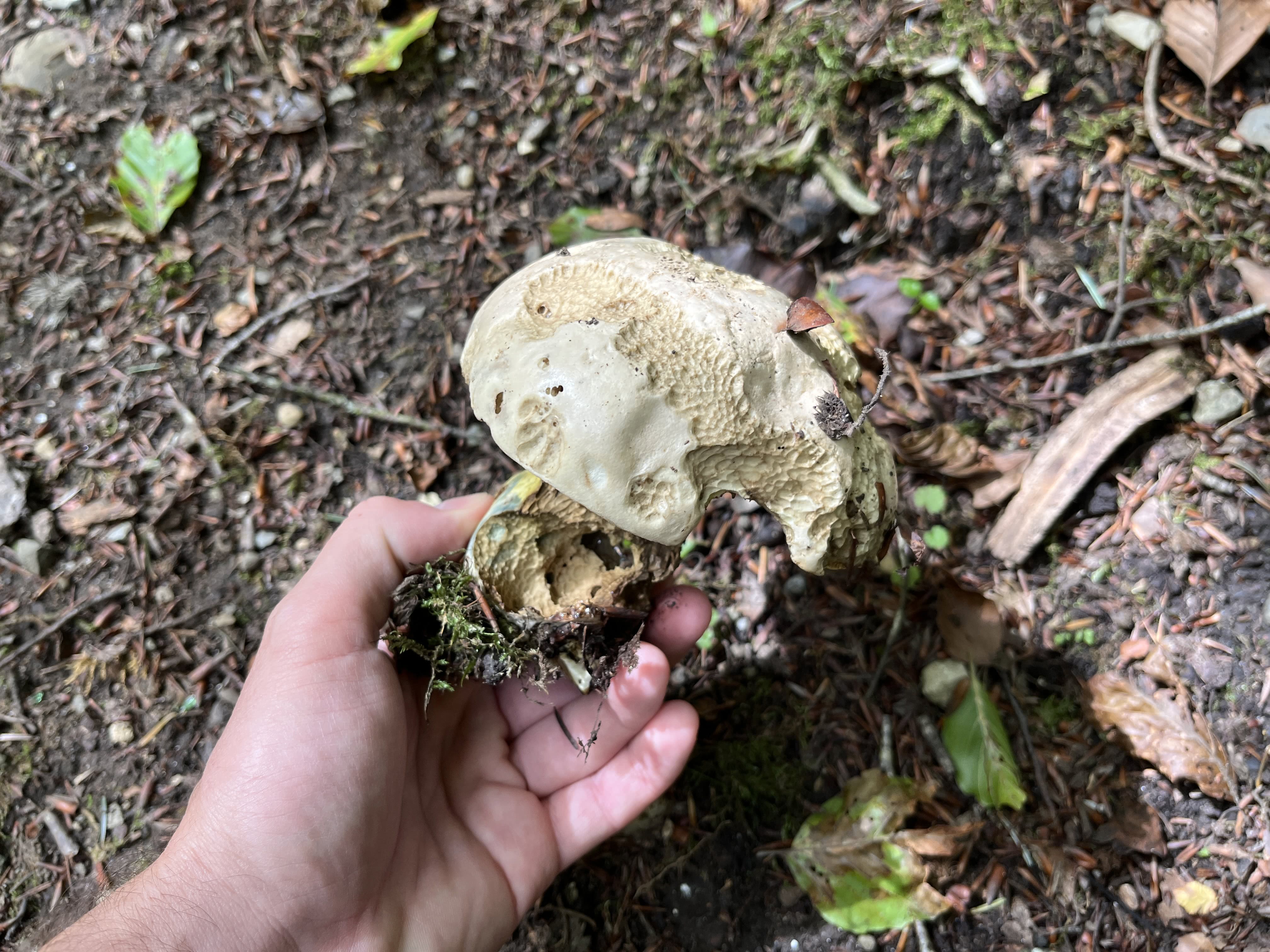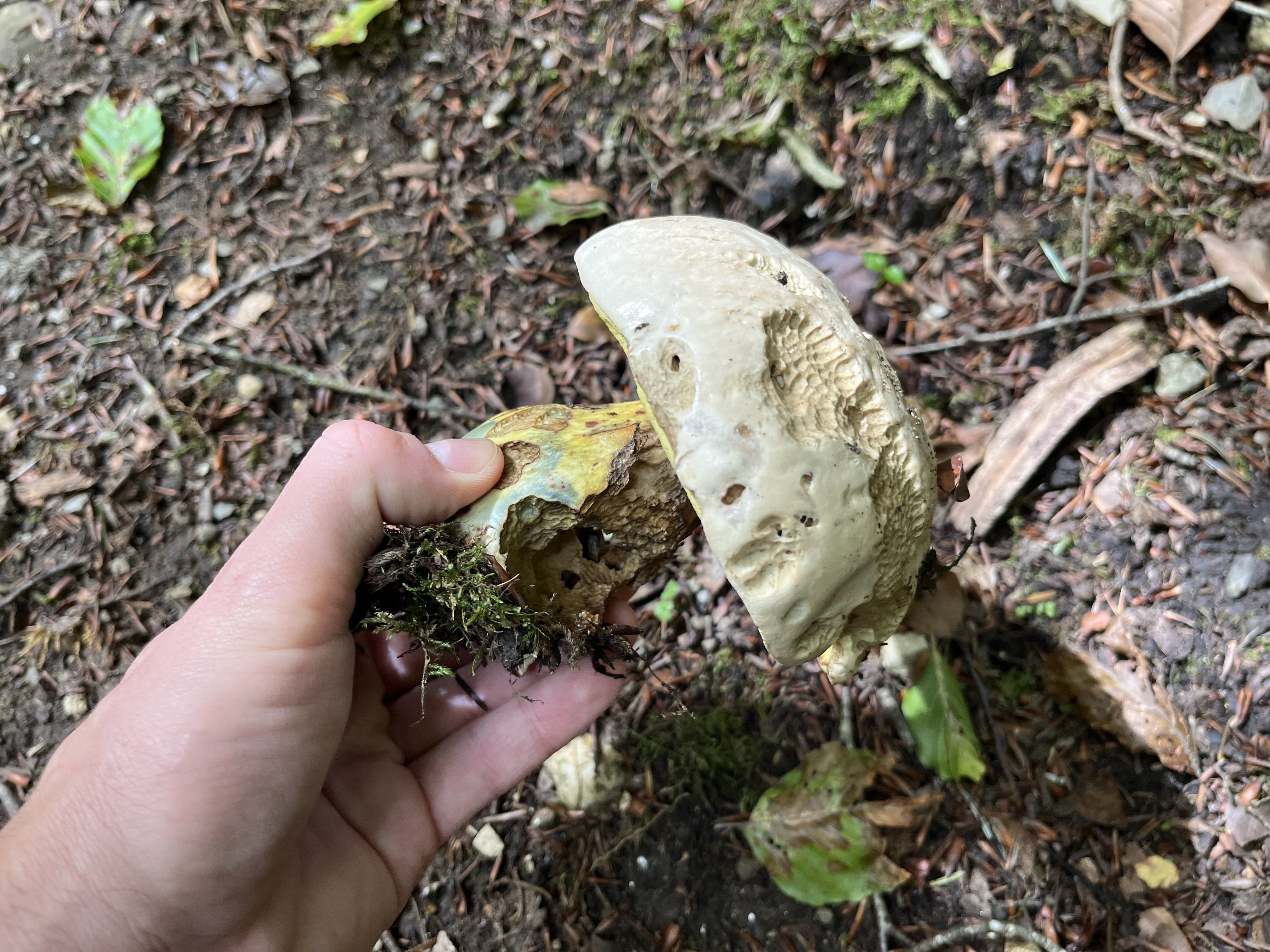 I cappelli grigio chiaro sono solitamente ammaccati e deformati, soprattutto negli esemplari più maturi. È una bella sorpresa, quindi, quando si guarda sotto il cappello e si scoprono dei bei pori gialli che diventano pallidi o medio-blu se li si tocca.