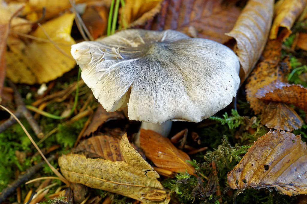 I cappelli di questi funghi raggiungono i 4 anni di età.12 cm di diametro a piena maturità, con una colorazione grigia con sfumature più scure verso il centro e linee radiali. Inizialmente hanno una forma convessa, ma si appiattiscono con la crescita, mostrando occasionalmente un leggero umbone.