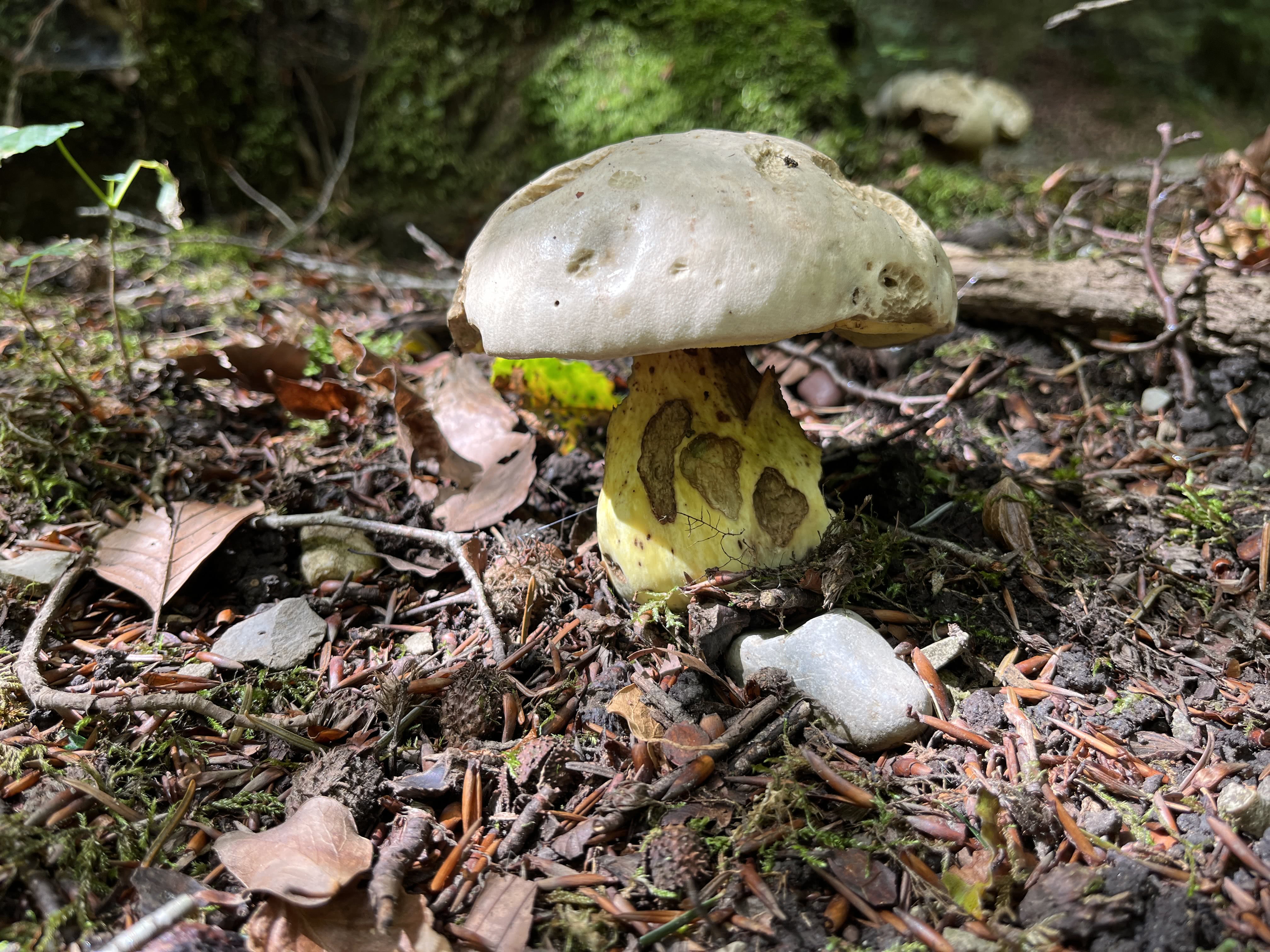 Caloboletus radicans is een grote boleten die laag bij de grond groeit, vaak kunnen de misvormde hoedjes verward worden met stenen of rotsen op de grond.