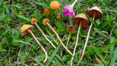 Group of small yellowish/tan mushrooms growing in the grass by side of the road near the beach. Close-cropped grassland such as lawns, golf courses, parks, and dune slacks seems to suit these conecaps well, but they can also appear on leaf litter, sawdust and woodchip mulch as well as on disturbed nutrient-rich soil in parks, orchards and gardens.