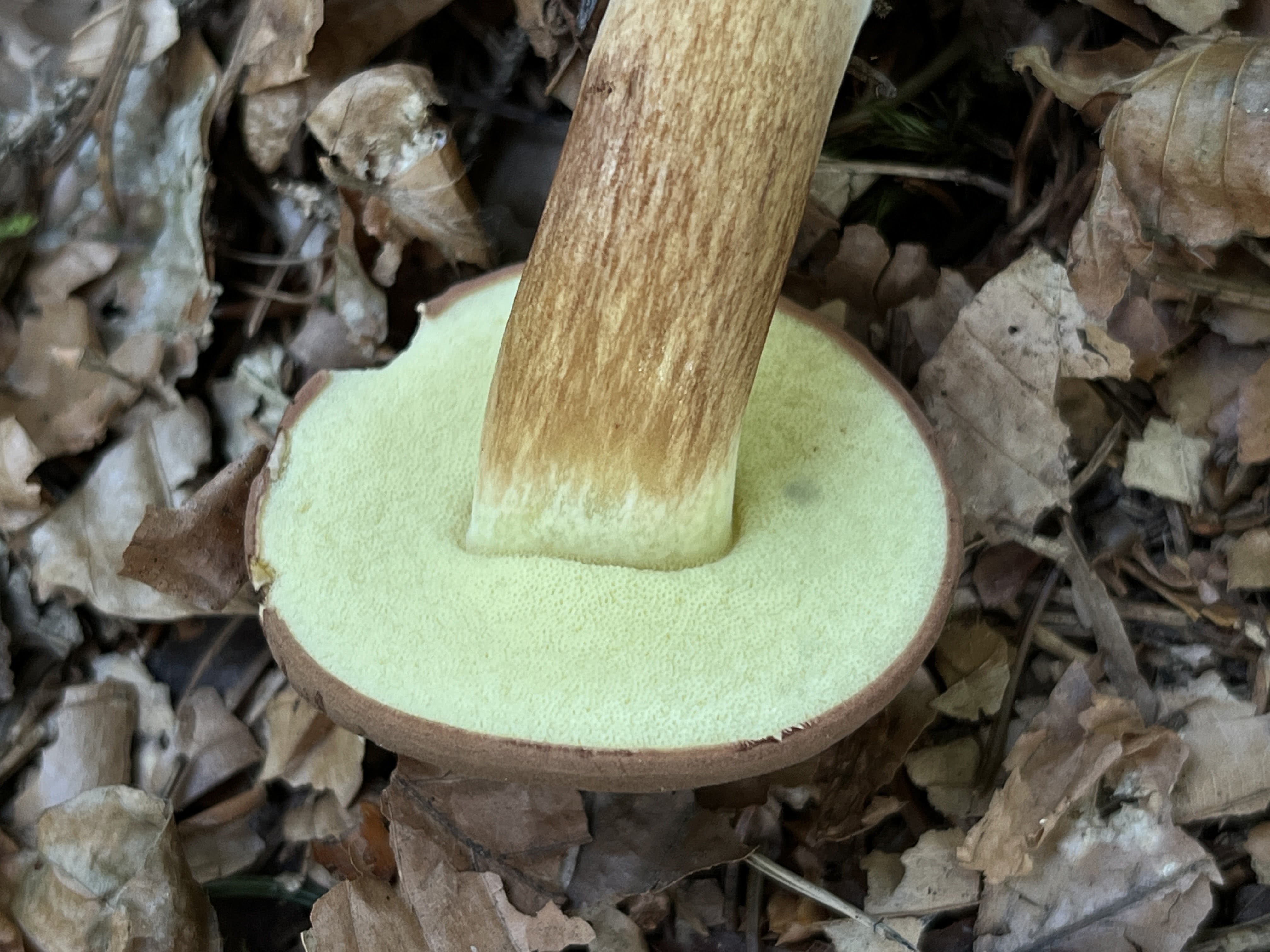 A parte inferior do cogumelo é amarela pálida, tornando-se amarela e eventualmente castanha-amarelada suja. Pode mudar de cor para azul-acinzentado quando ferida. Existem 2-3 poros por mm, e os tubos por baixo têm até 1 cm de profundidade e tornam-se azeitona à medida que o cogumelo amadurece.