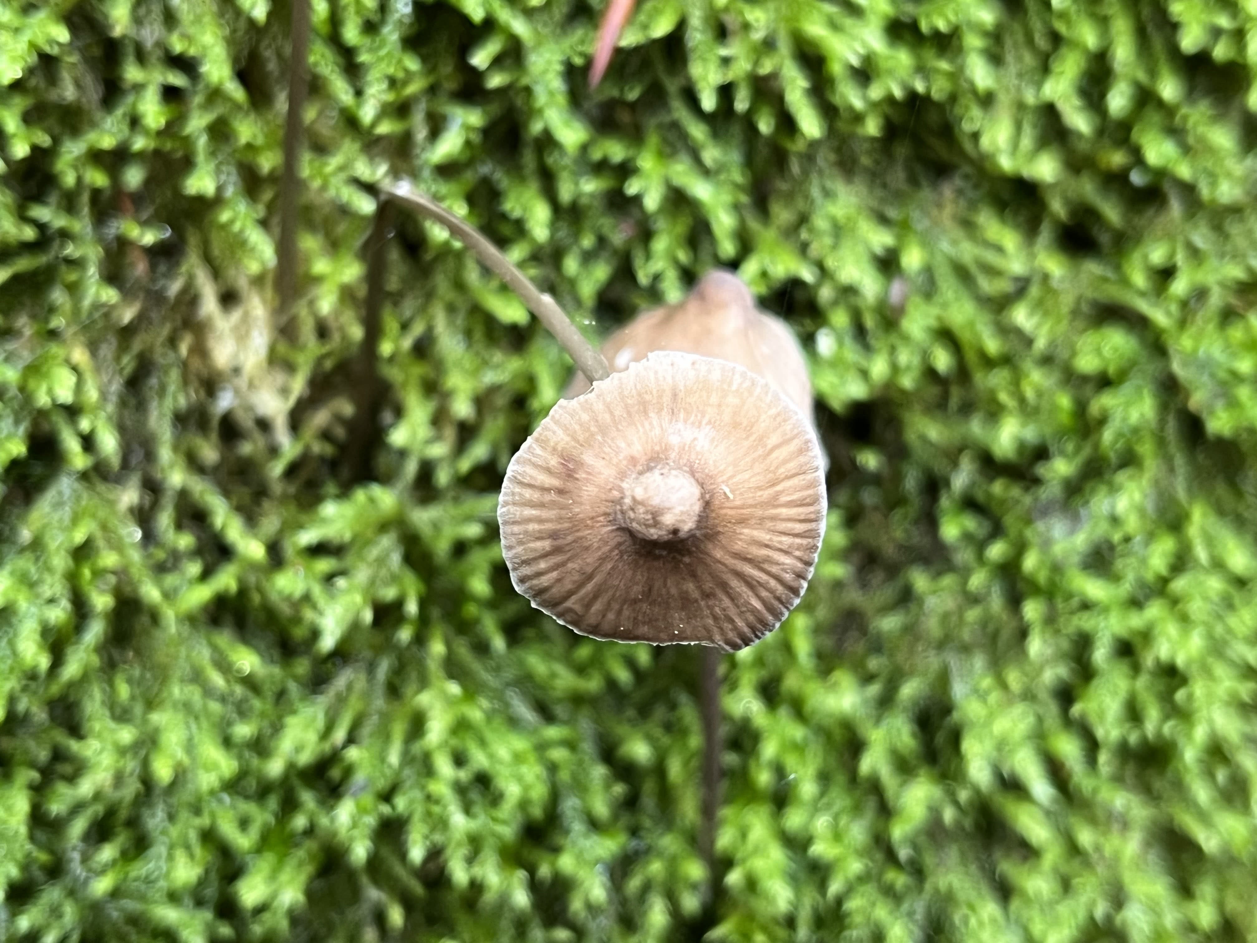 O chapéu tem forma de ovo quando jovem, tornando-se mais tarde cónico a algo em forma de sino, e eventualmente atingindo um diâmetro de 0.5 a 2.5 cm (0.2 a 1.0 in). Na idade, tem frequentemente uma margem curvada para dentro e um umbo proeminente. A superfície do gorro tem um brilho de caruncho (restos do véu universal que outrora cobria o corpo do fruto imaturo) que rapidamente se desprende, deixando-o nu e liso.
